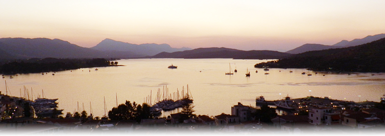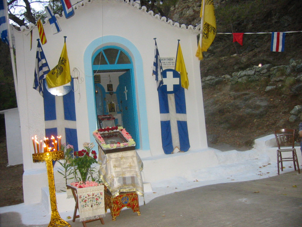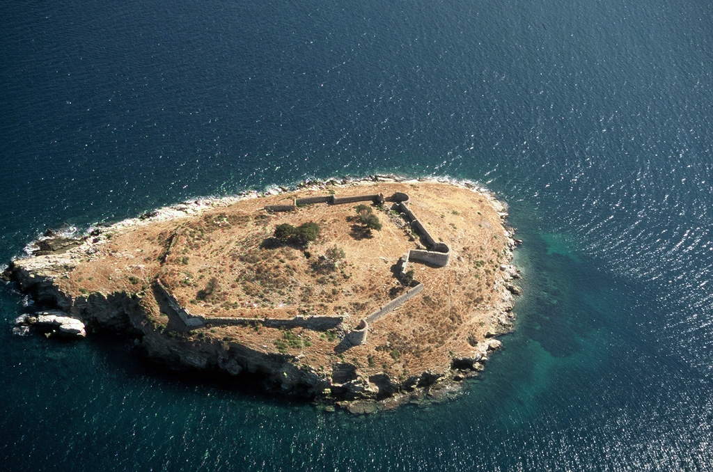 Poros and the white-washed two-story homes in Brinia, Mylos,